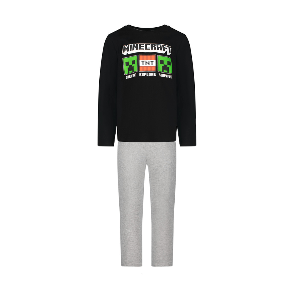 Den svarta toppen har en snygg bild av två creepers och en TNT-låda, samt texten "Create Explore Survive", vilket ger en kreativ och spännande spelkänsla. Den grå nederdelen ger en avslappnad känsla och gör denna pyjamas till ett skönt och bekvämt plagg för vardagsbruk.